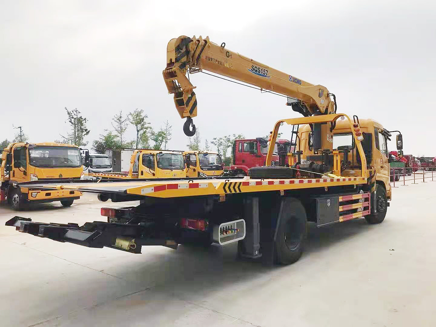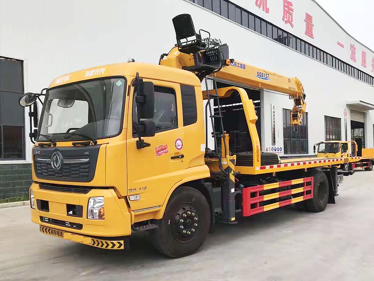 專用功能配置:上裝采用 6mm 高強度花紋板制作,(防滑能力強,承載能力高,外表美觀),該車平板總長度為 6.5米(含尾部板長 1.1 米),寬 2.55 米,平板承載質量為 10噸。采用嘉善取力器,長源泵、意大利海德閥 加兩個平衡閥,液壓油管采用耐壓雙層鋼絲油管,抗壓力達到 18 兆帕,1 個工具箱,配兩個小車(**輪),4 根捆綁帶,L 型抱胎架一對,托叉一對,托叉座一對,鏈鉤一條,后工作燈 2 只,1 個 10噸液壓絞盤(30米鋼絲繩), 10噸三節臂后拖舉.